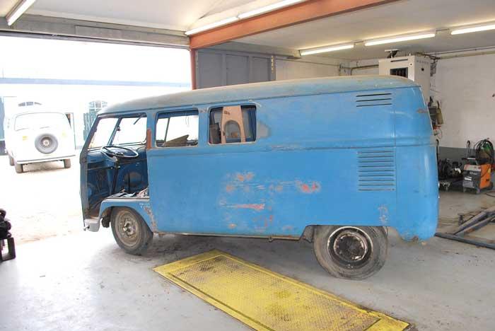 VW T1 1956, 9 raams, origineel portugese bus met safari voorruiten, uitzet knipperlichten, gepersde bumpers, motorklep met een centraal remlicht, originele kleur is tauben blauw, 3-zits bank voorin, 30 PK motor. ###### VW T1 1956, 9 window, original Portugees bus with safari front windows, semaphores, central brake light decklid, dove blue, 3 seats in the front, pressed bumpers, 30 HP engine more phots at http://picasaweb.google.com/vwsplitparts/VWSPLITBUS1956FORSALE#